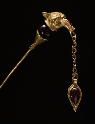 Keywords: Greek - Pin with Lynx Head - Walters 57384 - View A.jpg The top of the gold pin is a finely modeled lynx head A small molding on the shaft of the pin keeps the garnet bead and conical collar from slipping off One setting with a tear-drop garnet is firmly fixed in the lynx's mouth by a pin the extremity of which is looped Chained to the loop is a second tear-drop garnet century 1 BC Hellenistic gold garnets cm 19 accession number 57 384 9557 Collection of F L van Gans Frankfurt date and mode of acquisition unknown Galerie Bachstitz The Hague Henry Walters city Baltimore Walters Art Museum Henry Walters Acquired by Henry Walters 1921 Jewelry - Ancient to Modern The Walters Art Gallery Baltimore 1979-1980 place of origin Greece Walters Art Museum license Ancient Greek art in the Walters Art Museum Jewellery in the Walters Art Museum Art from Greece Media contributed by the Walters Art Museum needs category review |