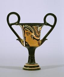 | Keywords: Greek - Red-Figure Kantharos (Drinking Vessel) with Female Head - Walters 482763 - View A.jpg Vase painters in Apulia developed two major styles the Plain style characterized by simple decoration and few figures and the Ornate style which featured multi-figure colorful scenes lavish ornaments and intricate floral compositions A large female head is a typical decoration for drinking vessels like this one small-scale vases cups and plates created in the Plain style between 320 310 BC Hellenistic terracotta cm 20 32 ; cm 18 1 max w accession number 48 2763 27671 Horia Puscasiu date and mode of acquisition unknown Marilyn and Herbert Scher Pikseville 1984 by purchase Walters Art Museum Gift of Marilyn and Herbert Scher 2003 place of origin Apulia Italy Walters Art Museum license Ancient Greek red-figure pottery in the Walters Art Museum Art from Greece Ancient Greek kantharoi Media contributed by the Walters Art Museum needs category review Women heads in ancient Greek pottery |