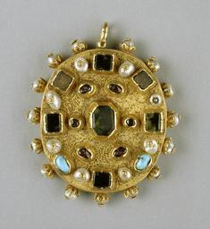 | Keywords: Greek - Reliquary Pendant with Virgin and Child - Walters 571511 (2).jpg This exceptional pendant consists of a reliquary cross inside a hinged case with six small adjacent compartments for relics The impressive amethyst cameo depicting the Virgin and Child on the lid is surrounded by cabochon rubies and emeralds alternating with pearls The cross and the outer edge of the case are adorned with additional pearls and the back of the case is decorated in a similar fashion omitting the central cameo A ground of dense filigree covers the front and back of the case while the inside as well as the inscription and the Crucifixion scene on the cross are done in niello The text identifies the donor location and the time when the piece was crafted which is rare in Post-Byzantine jewelry the cross was dedicated by the Metropolitan Arsenios of Serres a town in northern Greece to the monastery of St John on the island of Chalke near Constantinople in the middle of the 16th century middle Other date century 16 Post-Byzantine gold amethyst emeralds rubies pearls semiprecious stones niello Lid cm 6 51 6 19 0 95 ; Back H with lope 3 3/8 x W 2 13/16 x D 5/8 in 8 57 x 7 14 x 1 59 cm ; Back H without lope cm 7 78 ; Cross H with lope 2 1/16 x W 1 1/4 x D 1/4 in 5 24 x 3 18 x 0 64 cm accession number 57 1511 19177 Metropolitan Arsenios Serres Greece Monastery of the Holy Trinity called Esopotron Chalke date and mode of acquisition unknown Henry Walters Baltimore date and mode of acquisition unknown Walters Art Museum Henry Walters Acquired by Henry Walters Translation 57 1511A on amethyst Mother of God / Jesus Christ; Translation 57 1511B on outer rim of inside face + Lord help Arsenius most holy and venerable metropolitan of Serres and locum tenens of Caesaria in Cappadocia; Translation 57 1511C on cross top Jesus Christ / The king of the Jews; Translation 57 1511C on face of the cross Thou hast redeemed us by Thy precious blood nailed to the cross ; Translation 57 1511C around sides of the cross a later inscription Presented by the most holy metropolitan of Serres Arsenius to the Monastery of the Holy Trinity called Esoptron on the island of Chalke Early Christian and Byzantine Art Baltimore Museum of Art Baltimore 1947 Exhibition of Gold The Cleveland Museum of Art Cleveland 1947-1948 New York World's Fair 1964 Protestant and Orthodox Pavilion Protestant and Orthodox Pavilion New York World's Fair New York 1964 Jewelry - Ancient to Modern The Walters Art Gallery Baltimore 1979-1980 The Taste of Maryland Art Collecting in Maryland 1800-1934 The Walters Art Gallery Baltimore 1984 Objects of Adornment Five Thousand Years of Jewelry from the Walters Art Gallery Baltimore Cooper-Hewitt National Design Museum New York; Chrysler Museum of Art Norfolk; Carnegie Museum of Art Pittsburgh; San Antonio Museum of Art San Antonio; Philbrook Museum of Art Tulsa; Honolulu Academy of Arts Honolulu; New Orleans Museum of Art New Orleans; Milwaukee Art Museum Milwaukee; Minneapolis Institute of Arts Minneapolis; Toledo Museum of Art Toledo; The John and Mable Ringling Museum of Art Sarasota 1984-1987 Jewelry from the Walters Art Museum and the Zucker Family Collection The Walters Art Gallery Baltimore 1987 Byzantium Faith and Power 1261-1557 The Metropolitan Museum of Art New York 2004 Bedazzled 5 000 Years of Jewelry from the Walters Art Museum Frist Center for the Visual Arts Nashville; The John and Mable Ringling Museum of Art Sarasota; The Walters Art Museum Baltimore 2006-2009 Treasures of Heaven The Cleveland Museum of Art Cleveland; The Walters Art Museum Baltimore; The British Museum London 2010-2011 place of origin Serres Greece <gallery> File Greek - Reliquary Pendant with Virgin and Child - Walters 571511 jpg </gallery> Walters Art Museum license Byzantine and Early Russian art in the Walters Art Museum Jewellery in the Walters Art Museum Art from Greece Media contributed by the Walters Art Museum needs category review Crosses in jewellery |