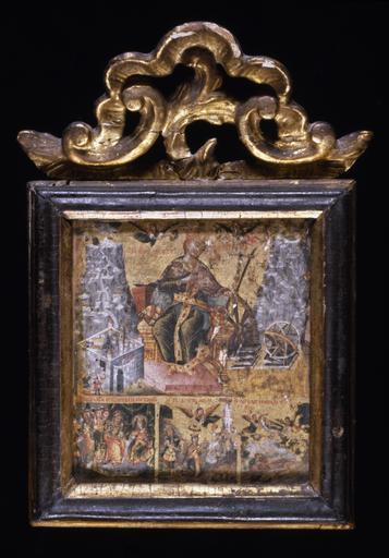 Keywords: Greek - Saint Catherine of Alexandria with Three Scenes from Her Life - Walters 372753.jpg According to legend Saint Catherine was a learned noble maiden from the Egyptian city of Alexandria who was martyred in the early 4th century on account of her Christian faith The three small scenes at the bottom of this panel illustrate episodes from her life the Roman empress is persuaded by Catherine to become a Christian; Catherine is beheaded by order of the pagan emperor; angels carry the saint's body to the top of a mountain on the Sinai Peninsula below is depicted the vision of Saint Eusthatius who was converted to Christianity when while hunting he saw a deer with a crucifix between its antlers The Monastery of Mount Sinai founded in the 6th century is now dedicated to Saint Catherine Its compound with two pilgrims approaching from the left is shown in the lower left corner of the upper larger composition Above it is Mount Sinai itself with several small chapels on its slopes and Moses receiving the Tablets of the Law on its summit Saint Catherine is portrayed in royal dress Two angels crown her with laurel wreaths and she holds a cross and a palm branch that signify her martyrdom for Christ To her right is a spoked wheel by means of which she was tortured before her execution Books compasses and an armillary sphere betoken Catherine's learning Behind them is Mount Catherine where the saint's body was miraculously rediscovered by the Sinai monks centuries after her death century 18 Early Modern tempera panel cm 15 88 15 24 approx accession number 37 2753 34067 Zoumboulakis Athens Greece by purchase Richard Howland Washington DC 1951 by purchase Walters Art Museum Gift of Richard Hubbard Howland 1998 Translation The empress came to believe in Christ The beheading of the saint The angels carried the saint s body to the mountain place of origin Greece Walters Art Museum license 3D Byzantine and Early Russian art in the Walters Art Museum Art from Greece Paintings in the Walters Art Museum Media contributed by the Walters Art Museum needs category review |
