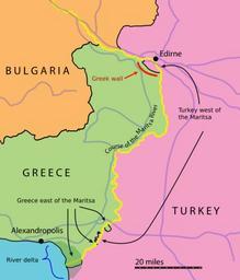 | Keywords: Greek Turkish Bulgarian borders and maritsa river.svg en The course of the Maritsa River indicating where Greek land lies east of it and where Turkish land lies west of it Also showing where it enters Bulgaria and ceases to form a national boundary National boundaries are shown in black Maritsa shown in yellow regional roadways shown in transparent blue Greek barrier wall shown as red line near Edirne 2015-09-07 own KDS4444 other versions cc-zero Uploaded with UploadWizard Maps of rivers in Greece Maps of rivers in Turkey Greece “Turkey border |
