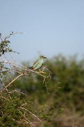 Keywords: green-breasted roller bird wildlife perched thorn bush colourful plumage