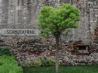 Keywords: green grass meadow bush nature wall facade stone caption brick outer wall tree log wood brown leaves leaf road aesthetic austria wiener neustadt