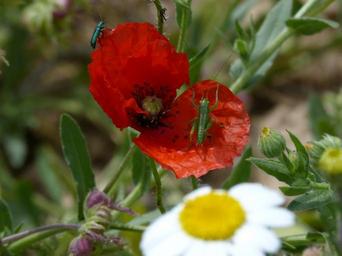 Keywords: green grasshopper green beetle poppy ababol rosella spring flowers insects