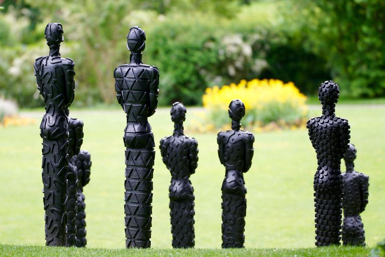 Keywords: green meadow bush statues form geometry upright art