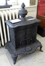 | Keywords: Green Mountain Parlor Stove No. 3, H. J. Ruggles Foundry, Poultney, Vermont, c. 1850, cast iron - Bennington Museum - Bennington, VT - DSC08557.JPG en Exhibit in the Bennington Museum - Bennington Vermont USA This work is in the public domain because the artist died more than 70 years ago Photography was permitted in the museum without restriction 2015-02-28 12 57 22 own Daderot other versions cc-zero Heating stoves in the Bennington Museum | ||||