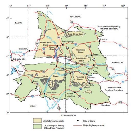 | Keywords: Green River Fmn Oil Shale Map.jpg en Areas of oil shale of the Green River Formation Colorado Utah and Wyoming USGS 2013-01-31 15 23 30 US Geological Survey Website http //energy usgs gov/OilGas/UnconventionalOilGas/OilShale aspx 3894240-research US Geological Survey other versions PD-USGov Uploaded with UploadWizard Oil shale |