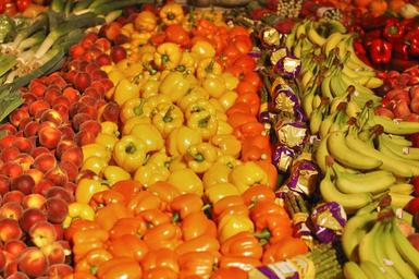 Keywords: greengrocers fruit banana asparagus peppers yellow vegetables mix fruit still life food since