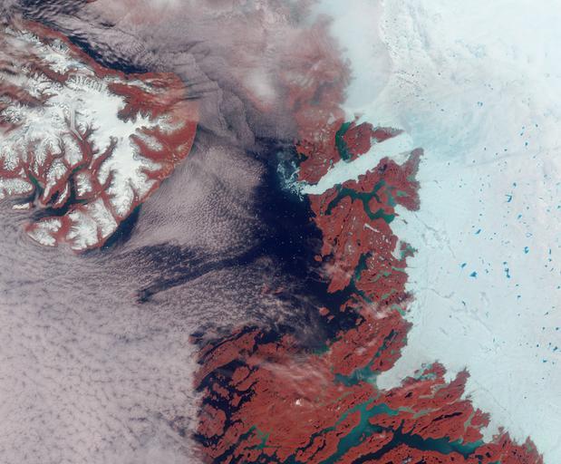 | Keywords: Greenland Ilulissat.jpg From http //earthobservatory nasa gov/Newsroom/NewImages/images php3 img_id 16405 The Jakobshavn/Ilulissat Glacier on the western coast of Greenland a World Heritage site This image is a false-color near-infrared green blue view acquired by the Multi-angle Imaging SpectroRadiometer ™s nadir camera The brightness of vegetation in the near-infrared contributes to the reddish hues; glacial silt gives rise to the green color of the water; and blue-colored melt ponds are visible in the bright white ice A scattering of small icebergs in Disco Bay adds a touch of glittery sparkle to the scene The large island in the upper left is called Qeqertarsuaq To the east of this island and just above image center is the outlet of the fast-flowing Jakobshavn or Ilulissat glacier Jakobshavn is considered to have the highest iceberg production of all Greenland glaciers and is a major drainage outlet for a large portion of the western side of the ice sheet Icebergs released from the glacier drift slowly with the ocean currents and pose hazards for shipping along the coast PD-USGov Satellite pictures of Greenland World Heritage Sites in Greenland Glaciers of Greenland False-color satellite images Satellite pictures of glaciers Color-infrared satellite pictures Supraglacial lakes of Greenland |