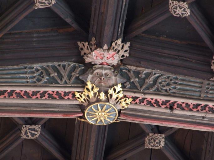 | Keywords: GreenMan.jpg en Carved face on roofbeam of 16th century roof in church of St Helen Witton Northwich Cheshire; probably a representation of a member of the locally-notable Venables family possibly William Venables Despite the image title this is NOT a 'Green Man' - there is no vegetation issuing from the face own RLamb 2010-02-06 Interiors of churches in Cheshire St Helen Witton Church interior Cheshire Roofs in the United Kingdom | ||||