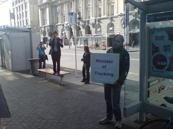 | Keywords: Greens Protest For City Rail Link II.jpg en A protest in favour of building the City Rail Link rail tunnel under Auckland CBD by the Greens Party Gareth Hughes on the loudhailer and a protester with a Steven Joyce then transport minister mask 2011-05 own Ingolfson other versions cc-zero Uploaded with UploadWizard Green Party of Aotearoa New Zealand Britomart Transport Centre Events in Auckland 2011 in Auckland Rail transport in Auckland Paper masks Demonstrations and protests relating to transport in New Zealand Gareth Hughes politician Bus shelters in New Zealand Steven Joyce |