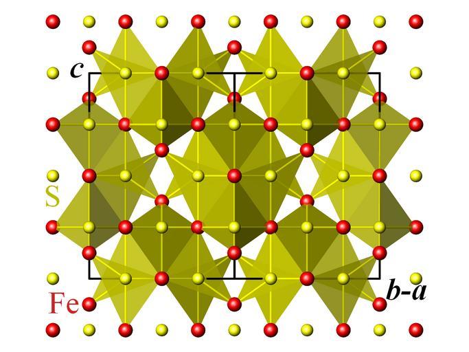 Keywords: Greigite structure 110 SFe4 tetrahedra.png en Crystal structure of greigite Fe<sup>II</sup>Fe<sup>III</sup><sub>2</sub>S<sub>4</sub> space group Fd<span style text-decoration overline >3</span>m projected along the 110 direction with emphasis on the SFe<sub>4</sub> tetrahedra The iron atoms are represented in red and the sulfur atoms in yellow Image drawn with the program ATOMS version 5 1 Data source B J Skinner F S Grimaldi et al Greigite the thio-spinel of iron; a new mineral Am Mineral vol 49 no 5-6 1964 p 543-555 own Perditax 2012-01-07 Greigite Crystal structures in space group number 227 Cc-zero |