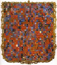 | Keywords: Grenville Diptych edit.jpg Edit for WP FPC The Stowe Armorial coat of arms is the centrepiece of the Gothic Library at Stowe http //en wikipedia org/wiki/Stowe_House The Library was commissioned by George Nugent-Temple-Grenville 1st Marquess of Buckingham See Viscount Cobham http //en wikipedia org/wiki/Viscount_Cobham and built to a design by Sir John Soane http //en wikipedia org/wiki/John_Soane between 1805 and 1807 The armorial is a 1 4m diameter heraldic painting of the 719 quarterings of the Temple Nugent Brydges Chandos and Grenville families including ten variations of the English Royal arms the arms of Spencer De Clare Valence Mowbray Mortimer and De Grey The painting is signed and dated P Sonard 1806 <ref>Stowe House Michael Bevington 2002 </ref> Stowe Armorial ou Armorial Grenville à Stowe ; réalisé entre 1822 et 1839 pour Richard Temple-Grenville marquis de Chandos et fils du premier duc de Buckingham et de Chandos afin de mettre en valeur les 719 quartiers de la famille Il est considéré comme exemple extravagant de triage héraldique Ce blasonnement est la pièce maîtresse de la Bibliothèque néogothique de Stowe_House commanditée par George Nugent-Temple-Grenville 1er marquis de Buckingham Voir http //en wikipedia org/wiki/Viscount_Cobham Vicomte Cobham et construit selon les plans de Sir John Soane entre 1805 et 1807 Cet armorial est une peinture héraldique large de 1 4 m des 719 quartiers des familles Temple Nugent Brydges Chandos et Grenville incluant dix variations des armoiries royales anglaises les armes de Spencer de De Clare de Valence de Mowbray de Mortimer et De Grey Cette oeuvre est signée et datée P Sonard 1806 unknown 1806 P Sonard Image is in the public domain because of its age It is more than 150 years old as of 2006 See File Grenville_Diptych jpg File Grenville_Diptych_edit2 jpg PD-old-100 Diptychs Heraldic divisions Paintings of coats of arms Stowe Armorial |