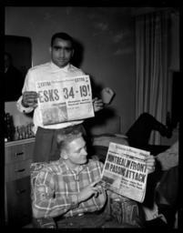 | Keywords: people blackandwhite monochrome text indoor black and white Men holding newpapers showing Grey Cup headlines VPL Accession Number: 43917 Date: November 28, 1955 Photographer/Studio: Province Newspaper Content: Montreal Alouettes vs Edmonton Eskimos Topic: Football Grey Cup Sports Newspapers Location: British Columbia - Vancouver More information on our historical photograph collection: www.vpl.ca/historicalphotos Men holding newpapers showing Grey Cup headlines VPL Accession Number: 43917 Date: November 28, 1955 Photographer/Studio: Province Newspaper Content: Montreal Alouettes vs Edmonton Eskimos Topic: Football Grey Cup Sports Newspapers Location: British Columbia - Vancouver More information on our historical photograph collection: www.vpl.ca/historicalphotos |