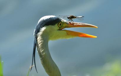 Keywords: grey heron blue arrow dragonfly emergency landing nose walldorf fishing pond