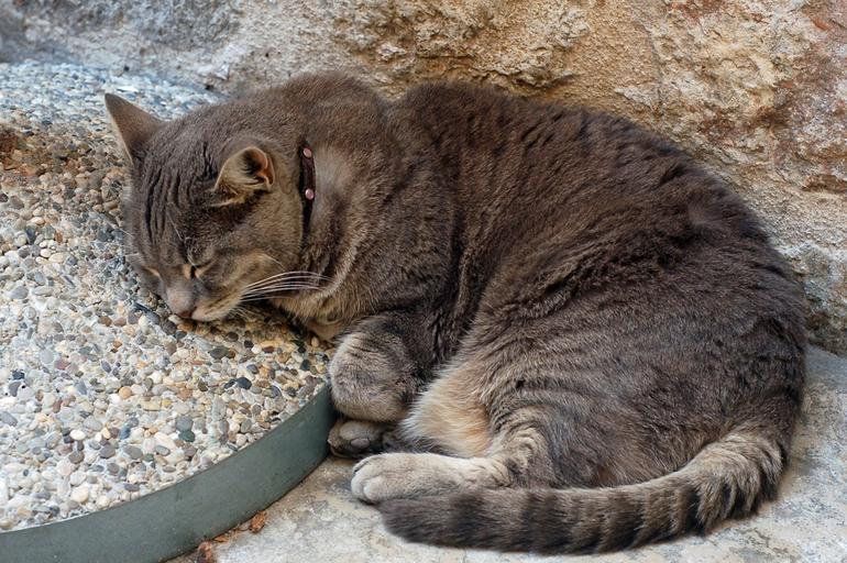 Keywords: grey tabby cat sleeping pebbles wall beige brown