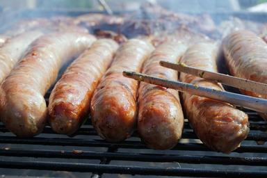 Keywords: grill sausage grilling grill sausage barbecue bratwurst food eat meat sizzle snack fire heat grill sausages grilled meats barbecue tongs embers stainless barbecue grill barbeque picnic delicious smoke