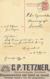 | Keywords: Schrijven van C.P. Tetzner aan F.R. van Egmond bloemenmagazijn te Deventer, waarin hij vraagt om de beuk ongefrankeerd terug te zenden. Carl Paul Tetzner (1865-1947) was een bekende Groninger die in zijn tijd een bloemenwinkel had. Hieronder enige berichten uit o.a. het Nieuwsblad van het Noorden. 10 januari 1898 BLOEMENWINKEL. Te Huur te Groningen. Het WINKELHUIS in de Heerestraat F 336, eerste stand, thans bewoond door den Heer C. P. TETZNER, waarin sedert vele jaren een Affaire in BLOEMEN is en nog wordt uitgeoefend; bevattende beneden: Winkel, Kantoor, Werkplaats, Open Plaats en achteruitgang, en boven: zes Kamers, Keuken en Meidenkamer, Zolder en Kelderruimte. (489) Te aanvaarden 1 Mei 1898, en te bevragen by den Eigenaar den Heer G. B. A. GRONOVER en bij den Heer J. L. LA GRO J. Lzn., Kantoor voor Vaste Goederen, A. KERKHOF, Groningen. 20 mei 1935 De heer C. P. Tetzner vierde vandaag onder vele blijken van belangstelling zijn 70-sten verjaardag. Niet alleen door zijn bloemenzaak is de heer Tetzner een bekend ingezetene, maar bovenal door de artistieke wijze, waarop hij in de organisatie van verschillende tentoonstellingen zijn medewerking verleende. Ook in de voorbereiding van de groote tentoonstelling „Het Noorderlicht" heeft de heer Tetzner, in samenwerking met den architect J. A. Boer, een belangrijk aandeel. 17 mei 1947 In de ouderdom van bijna 82 jaar is hier ter stede overleden de heer C. P. Tetzner. De heer Tetzner, een Duitser van geboorte, kwam op jeugdige leeftijd naar Groningen, waar hij een bloemenzaak opende. Door zijn grote vakkennis en verfijnde smaak wist hij deze bloemenwinkel in de 40 jaar, dat hij er de leiding van had, te maken tot een van de allerbeste in onze stad. Voor tal van tentoonstellingen verzorgde hij de bloemenversieringen en in de tijd van de beroemde studentenbals was het ook steeds de heer Tetzner, die een even feestelijke als artistieke versiering aanbracht. Van de Evang. Lutherse Gemeente was de heer Tetzner kerkelijk rentmeester. De teraardebestelling is gesteld op Dinsdagmorgen op Esserveld. 23 april 1953 De oudste bloemenzaak in onze stad, die der firma C. P. Tetzner, bestaat deze maand 65 jaar. Reeds vele jaren is deze firma gevestigd in de Guldenstraat. Eerst in het perceel no. 12, dat in 1927 — het jaar dat de heer J. C. A. Corporaal als mede-firmant toetrad — geheel werd verbouwd en na de bevrijding in het pand Guldenstraat 6. De huidige firmanten, de heren J. C. A. en W. E. Corporaal, besloten het jubileum op bijzondere wijze te herdenken. Onder leiding van de Groninger kunstschilder K. van Dijk lieten zij de bestaande winkelruimte een keer zo groot maken en in moderne luifelstijl inrichten. De schat van bloemen en planten, de-magnifieke pottenbakkerskunst en ook de geestige natuurfantasieën — een artikel waarmee ongetwijfeld veel succes zal worden geoogst — kunnen thans op smaakvolle wijze worden geëxposeerd. Schrijven van C.P. Tetzner aan F.R. van Egmond bloemenmagazijn te Deventer, waarin hij vraagt om de beuk ongefrankeerd terug te zenden. Carl Paul Tetzner (1865-1947) was een bekende Groninger die in zijn tijd een bloemenwinkel had. Hieronder enige berichten uit o.a. het Nieuwsblad van het Noorden. 10 januari 1898 BLOEMENWINKEL. Te Huur te Groningen. Het WINKELHUIS in de Heerestraat F 336, eerste stand, thans bewoond door den Heer C. P. TETZNER, waarin sedert vele jaren een Affaire in BLOEMEN is en nog wordt uitgeoefend; bevattende beneden: Winkel, Kantoor, Werkplaats, Open Plaats en achteruitgang, en boven: zes Kamers, Keuken en Meidenkamer, Zolder en Kelderruimte. (489) Te aanvaarden 1 Mei 1898, en te bevragen by den Eigenaar den Heer G. B. A. GRONOVER en bij den Heer J. L. LA GRO J. Lzn., Kantoor voor Vaste Goederen, A. KERKHOF, Groningen. 20 mei 1935 De heer C. P. Tetzner vierde vandaag onder vele blijken van belangstelling zijn 70-sten verjaardag. Niet alleen door zijn bloemenzaak is de heer Tetzner een bekend ingezetene, maar bovenal door de artistieke wijze, waarop hij in de organisatie van verschillende tentoonstellingen zijn medewerking verleende. Ook in de voorbereiding van de groote tentoonstelling „Het Noorderlicht" heeft de heer Tetzner, in samenwerking met den architect J. A. Boer, een belangrijk aandeel. 17 mei 1947 In de ouderdom van bijna 82 jaar is hier ter stede overleden de heer C. P. Tetzner. De heer Tetzner, een Duitser van geboorte, kwam op jeugdige leeftijd naar Groningen, waar hij een bloemenzaak opende. Door zijn grote vakkennis en verfijnde smaak wist hij deze bloemenwinkel in de 40 jaar, dat hij er de leiding van had, te maken tot een van de allerbeste in onze stad. Voor tal van tentoonstellingen verzorgde hij de bloemenversieringen en in de tijd van de beroemde studentenbals was het ook steeds de heer Tetzner, die een even feestelijke als artistieke versiering aanbracht. Van de Evang. Lutherse Gemeente was de heer Tetzner kerkelijk rentmeester. De teraardebestelling is gesteld op Dinsdagmorgen op Esserveld. 23 april 1953 De oudste bloemenzaak in onze stad, die der firma C. P. Tetzner, bestaat deze maand 65 jaar. Reeds vele jaren is deze firma gevestigd in de Guldenstraat. Eerst in het perceel no. 12, dat in 1927 — het jaar dat de heer J. C. A. Corporaal als mede-firmant toetrad — geheel werd verbouwd en na de bevrijding in het pand Guldenstraat 6. De huidige firmanten, de heren J. C. A. en W. E. Corporaal, besloten het jubileum op bijzondere wijze te herdenken. Onder leiding van de Groninger kunstschilder K. van Dijk lieten zij de bestaande winkelruimte een keer zo groot maken en in moderne luifelstijl inrichten. De schat van bloemen en planten, de-magnifieke pottenbakkerskunst en ook de geestige natuurfantasieën — een artikel waarmee ongetwijfeld veel succes zal worden geoogst — kunnen thans op smaakvolle wijze worden geëxposeerd. |