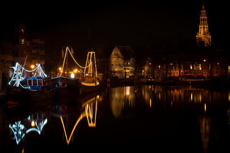 Keywords: groningen night lights boats water city old lantern dark netherlands canal reflection houses town evening