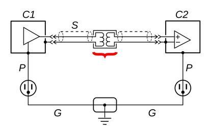 | Keywords: Ground loop solution - isolation transformer.svg isolation transformer in the signal cable A ground loop is an inadvertent electrical circuit or loop created by the ground wiring of electrical equipment Ground loops are a major cause of hum and interference in audio video and computer equipment because circulating currents induced by stray magnetic fields from nearby 50/60 Hz equipment can cause AC voltage dropped across signal grounds In this diagram two AC powered electronic components C1 and C2 are connected by a shielded signal cable S The ground shield of S along with the ground wire third wire P in the components' power cord and the building's utility ground wiring G form a ground loop <br /> One of the best ways to prevent such a ground loop is to insert an isolation transformer in the signal cable S as shown The transformer breaks the conductive path between the ground terminals of the components opening the loop preventing ground loop currents from flowing while allowing the AC signal to pass Unlike other solutions such as breaking the cable ground shield the isolation transformer can be used with a floating component one with no ground wire in its power cord without causing hum Cables incorporating isolation transformers can be purchased 2014-01-20 17 19 32 own Chetvorno cc-zero Uploaded with UploadWizard Ground loops |