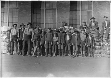 | Keywords: Group of boys working in Lancaster Cotton Mills. Smallest boy in middle said he has been in the mill off and on for 5... - NARA - 523118.jpg Scope and content General notes 523118 Local identifier 102-LH-338 Department of Commerce and Labor Children's Bureau 1912 - 1913 NARA-Author Hine Lewis Wickes 1874-1940 Photographer 1122914 <br /> Still Picture Records Section Special Media Archives Services Division NWCS-S National Archives at College Park 8601 Adelphi Road College Park MD 20740-6001 1908-11-30 Record group Record Group 102 Records of the Children's Bureau 1908 - 2003 Record group ARC 431 National Child Labor Committee Photographs taken by Lewis Hine compiled ca 1912 - ca 1912 documenting the period 1908 - 1912 Series ARC 523064 File unit File unit ARC Variant control numbers NAIL Control Number NWDNS-102-LH-338 Other versions <gallery> File Group_of_boys_working_in_Lancaster_Cotton_Mills _Smallest_boy_in_middle_said_he_has_been_in_the_mill_off_and_on_for_5 _-_NARA_-_523118 tif tif File Group_of_boys_working_in_Lancaster_Cotton_Mills _Smallest_boy_in_middle_said_he_has_been_in_the_mill_off_and_on_for_5 _-_NARA_-_523118 jpg jpg </gallery> NARA-cooperation PD-USGov Child labor in the United States |