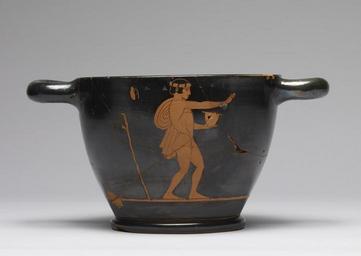| Keywords: Group of Ferrara T981 - Red-Figure "Skyphos" with Dancer and "Komast" - Walters 482121 - Side B.jpg This skyphos a large drinking cup depicts a dancer and a komast a drunken reveler The dancer lunges to the right with extended arms while the komast stands in profile holding a skyphos These scenes of festivity are fitting for this vessel which was associated with the symposium men's drinking party This particular piece bears evidence of ancient repairs several copper-alloy clamps-some now broken-were used to join the pieces of the damaged vessel indicating the value of the skyphos to the owner even after it had lost its function of holding liquid ca 475 450 BC Classical terracotta copper alloy cm 13 9 27 5 with handles; Diam at mout cm 18 7 ; Diam at foot cm 12 1 accession number 48 2121 29016 Sale XVI Basel June 30 1956 no 132 Paul I Ilton date and mode of acquisition unknown The Paul I Ilton Collection Sale Hans M F Schulman New York November 21 1959 no 637 Walters Art Msueum 1959 by purchase Museum purchase with funds provided by the S and A P Fund 1959 inscription place of origin Attica Greece Walters Art Museum license Ancient Greek red-figure pottery in the Walters Art Museum Media contributed by the Walters Art Museum needs category review Group of Ferrara T981 Media contributed by the Walters Art Museum needs artist update Komos scenes Symposium scenes in ancient Greek pottery Kalos inscriptions |