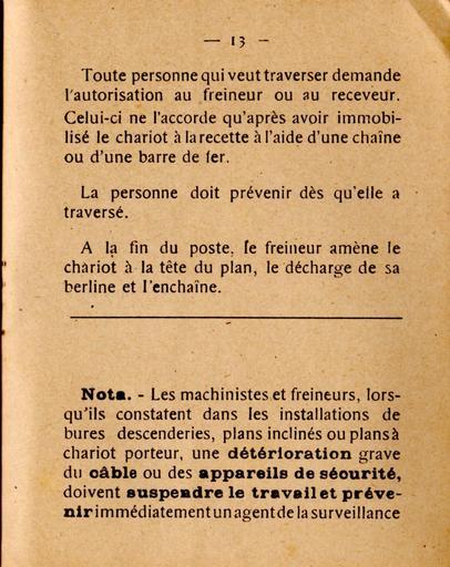 | Keywords: Groupe de Bruay, Mémento du rouleur (p13).jpg Le Mémento du rouleur est le règlement des rouleurs de berlines du Groupe de Bruay Dimensions Size cm 10 5 13 Groupe de Bruay filiale des HBNPC de Charbonnages de France s 1940 author PD-old Not-PD-US-URAA Groupe de Bruay Mémento du rouleur |