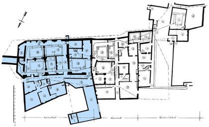 | Keywords: Grundriss oberer Badehauskomplex Aachen.jpg Grundriss des oberen Badehauskomplexes in Aachen bestehend aus Kaiserbad blau eingefärbt Kleinbad und Quirinusbad Oberstadtdirektor der Stadt Aachen Ed Bad Aachen seine Quellen und das Kaiserbad Aachen Kutsch ca 1964 p 12 1677 Adam Winants PD-old-100 Kaiserbad |