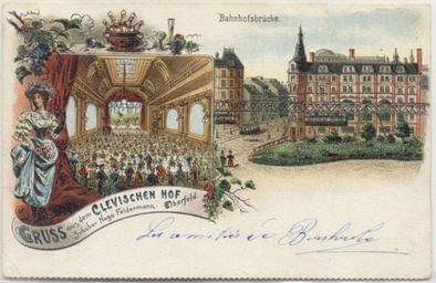 | Keywords: Gruß aus dem Clevischen Hof Elberfeld.jpg en Picture Postcard with lithgraphy showing Hotel Clevischer Hof in Elberfeld Germany de Bildpostkarte mit Lithografie vom Hotel Clevischer Hof in Elberfeld Deutschland Scan author before 1901 de Greetings from Clevischer Hof Elberfeld Owner Hugo Feldermann PD-old Wuppertal-Elberfeld-Mitte Postcards of Wuppertal Wuppertal Schwebebahn in art Former hotels in Wuppertal Wuppertal in the 1900s Wupperbrücke Alte Freiheit | ||||