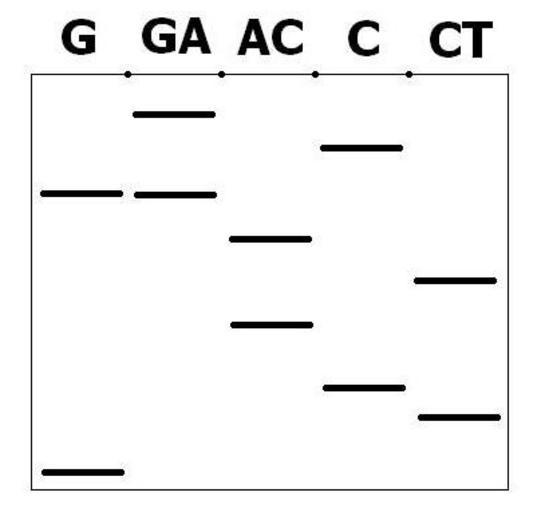 | Keywords: GTCATAGCA in maxam gilbert sequencing.jpeg  en Electrophoresis of short sequences created by Maxam-Gilbert sequencing technique The primary sequence GTCATAGCA is read from the bottom of the polyacrylamide gel own Vojtech dostal 2009-08-27 Electrophoresis |
