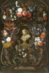 | Keywords: Gualterus Gysaerts - A garland of flowers surrounding the bust of Franciscus Rodius, Martyr of Gorkum.jpg Artwork Creator Gualterus Gysaerts 2015-08-06 Ucfirst Oil on canvas cm 114 6 77 8 http //www bonhams com/auctions/22647/lot/140/ Sold at Bonhams on 28 October 2015 in London lot 140 signed 'F G GYSAERTS IN F ' lower left and inscribed 'B Franciscus Rodius' on plinth centre other versions PD-old-100 Gualterus Gysaerts Martyrs of Gorkum | ||||