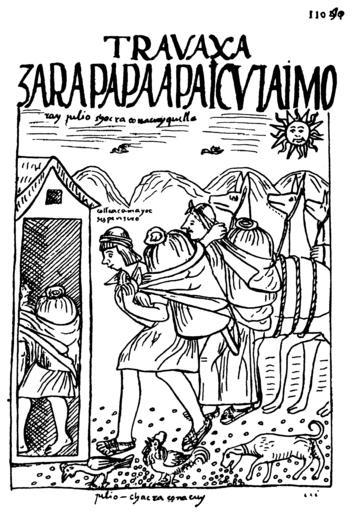 | Keywords: Guamán Poma 1615 1150 julio.png en p 1150 July ZARA PAPA APAICVI AIMOray Month of taking away the maize and potatoes of the harvest see original and comments on http //www kb dk/permalink/2006/poma/1160/en/text/ open id2978806 Guaman Poma Website fr Juillet mois pour rentrer le maïs et les pommes de terre récoltés es Julio mes de llevarse maíz y papa de cosecha Guamán Poma de Ayala Felipe 1615 Nueva corónica y buen gobierno Peruvian manuscript Felipe Guamán Poma de Ayala 1615 PD-old-100-1923 Maize illustrations Solanum tuberosum - botanical illustrations Felipe Guamán Poma de Ayala |