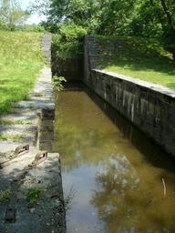 | Keywords: Guard Lock 4 on C and O Canal From NPS.jpg en Pic of Guard Lock 4 entering Big Slackwater on the Chesapeake and Ohio Canal The NPS site states Guard Lock 4 was completed in 1834 out of a smooth cut gray-blue limestone on the face This lock was used as a pass for all barges as the river becomes the canal for the next 3 3 miles The upper end of the lock passes through the guard dyke and the dyke is confined by vertical stone retaining walls The walls are 15' apart with a 15 recess on each side for a length of 10' for gate pockets The high walls through the guard dyke which is also the upper gate pocket is stepped down in 12 increments of layers of stone with 12 treads for 10 levels thereby decreasing the lock walls by 10' to the normal height The lock is 91'-5 between gate pockets The lock gate at the edge of the river was an unusual 20' tall Rather than a normal top and bottom iron gate post strap that lets into the stone quoin to support the wood posts a third strap was added midway between the top and bottom to help take the added weight off the particularly heavy gates Above the upper lock gate pocket the towpath walls extends for about 2' makes a ninety degree turn with a radius of 2' and runs for 21' along the river bank then tapers into the guard dyke The berm side extension is 15½' long A service bridge spans above the upper portion of the upper lock gate pocket The bridge is probably one of the many replacements of the original bridge that tow mules had to cross Some lock hardware remains National Park Service http //www hscl cr nps gov/insidenps/report asp STATE PARK CHOH STRUCTURE SORT RECORDNO 538 National Park Service Dept of Interior US Government Chesapeake Ohio Canal National Historical Park Locks water transport PD-USGov |