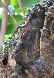 | Keywords: Guaya-wasp-nest-entrance.jpg The entrance to a paper-wasp nest on the lowest branches of a very dense dark-green Guaya tree Talisia olivaeformis JIM CONRAD'S NATURALIST NEWSLETTER Written in Sabacché and issued from a ciber in nearby Tekit Yucatán MÉXICO http //www backyardnature net/n/08/080929 htm http //www backyardnature net/n/08/080929px jpg 2008-09-29 Jim Conrad Jim Conrad See http //www backyardnature net/j/copyrite htm 20 39 37 N 89 22 18 W type city_region MX Wasp nests Tree hollow nests |