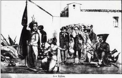 | Keywords: Guerra del pacífico 1879-1884 Caricatura 70.jpg es Patricio Ibarra Cifuentes escribió La idea de los dibujantes satíricos acerca de superioridad de Chile por sobre sus vecinos del norte queda de manifiesto en este grabado publicado por El Padre Cobos el 14 de noviembre de 1882 La república de Chile pisando el pabellón peruano portando bizarramente una corona de laureles y sosteniendo su bandera mira con desdén a la república del Perú la cual se encuentra de rodillas con ademán de ruego Tras ellas se observan los trofeos de Chile Perú Bolivia armas municiones y varios estandartes y un grupo de personas que acongojadas y pobremente vestidas observan la humillación de su Patria El Padre Cobos mira la escena sobre otro montón de artefactos de guerra y blasones como símbolo de victoria mientras el Negro cuchichea al oído de la republica de Chile Según reza el verso que acompaña esta caricatura el Perú le suplica a Chile le brinde su protección y ayuda para aliviar los males que la aquejan pues ninguno de sus gobernantes ha podido dar solución a ellos 1879-1884 http //www tesis uchile cl/tesis/uchile/2009/ibarra_pa/html/TH 4 html Chilean magazines El Ferrocarrilito El Padre Cobos El Diablo José Peluca El Barbero El Corvo Padre Padilla Diógenes other versions PD-old-70-1923 Chilean Caricatures in the War of the Pacific |