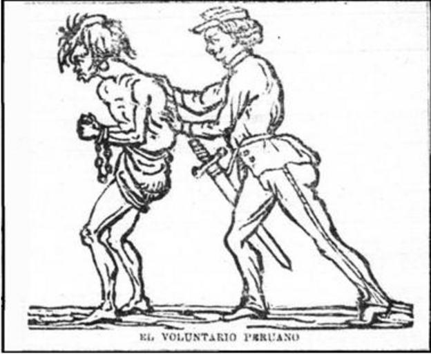 | Keywords: Guerra del pacífico 1879-1884 Caricatura 50.jpg es Patricio Ibarra Cifuentes escribe El Ferrocarrilito ironiza con la voluntariedad de los soldados peruanos durante la Guerra del Pacífico Este grabado muestra a un hombre engrillado siendo arrastrado por un militar probablemente un oficial pues porta un sable para incorporarlo a las filas del ejército Acompañando al dibujo publicado el 27 de abril de 1880 el periódico incluyó un verso donde se reproduce un diálogo entre estos dos personajes Allí el nuevo recluta pide ser liberado argumentando que en cuanto vea a sus adversarios chilenos huirá 1881 http //www tesis uchile cl/tesis/uchile/2009/ibarra_pa/html/index-frames html Caricaturas chilenas de la Guerra del Pacífico 1879-1884 La presente monografía presenta un análisis e interpretación de 105 caricaturas publicadas en periódicos humorísticos chilenos inspiradas en las causas desarrollo y consecuencias de la Guerra del Pacífico enfrentamiento armado que Chile llevó adelante contra la alianza formada por Perú y Bolivia durante los años 1879 y 1884 Divididos en seis categorías temáticas los grabados seleccionados muestran como los editores de los rotativos y sus dibujantes señalaron su particular punto de vista aportando con ello a la discusión pública emanada desde la prensa a propósito del conflicto del norte Asimismo se presenta un sucinto estudio de los diarios de sátira que vieron la luz mientras se llevaban a cabo las hostilidades caracterizándolos y ubicándolos a partir de la posición que ocuparon en el espectro político de la época http //www tesis uchile cl/tesis/uchile/2009/ibarra_pa/html/index-frames html http //www repositorio uchile cl/handle/2250/108555 Compiladas por Ibarra Cifuentes Patricio other versions PD-Art Chilean Caricatures in the War of the Pacific |
