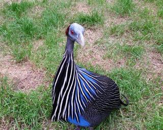 Keywords: guinea fowl geierperlhuhn numididae species galliformes bird plumage blue-black red eyes sitting striped