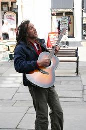 Keywords: guitarist musician street performer guitar playing play entertainment musical performance music melody sing singing player instrument man male solo perform adult singer performing