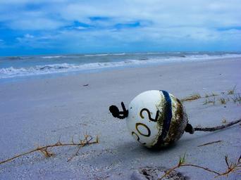 Keywords: gulf coast ocean sea outside sand beach sand nature gulf of mexico beach shore shoreline storm black and white crab trap float hurricane fishing sanibel island florida