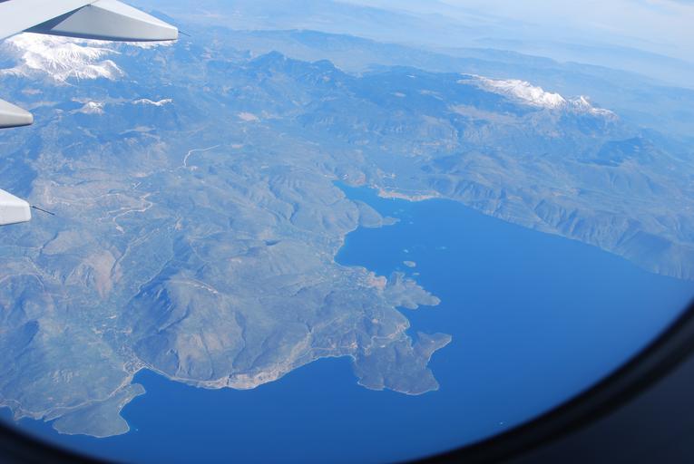 Keywords: Gulf of Corinth.jpg es En primer plano el Golfo de Corinto y la costa meridional de la Grecia central Fócide Al fondo a la derecha el monte Parnaso Entre estas montañas Delfos own Durutomo 2010-03-21 Aerial photographs of Greece