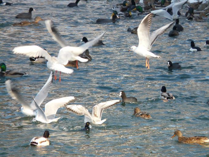 Keywords: gulls ducks coots water scrum feeding hustle and bustle fly wing