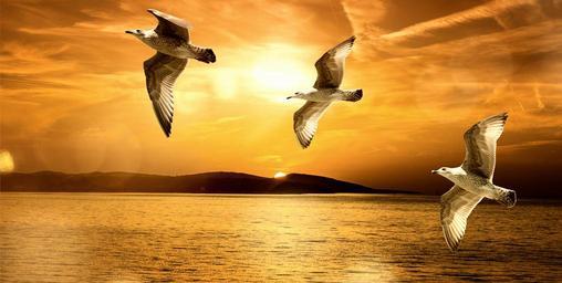 Keywords: gulls flight fly bird water bird animal water lake sea sunset lighting