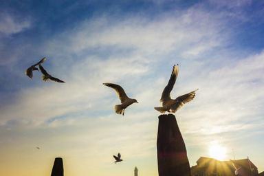 Keywords: gulls venice pile murano port sunset birds tribe nature day sit clouds gloaming sky fly free