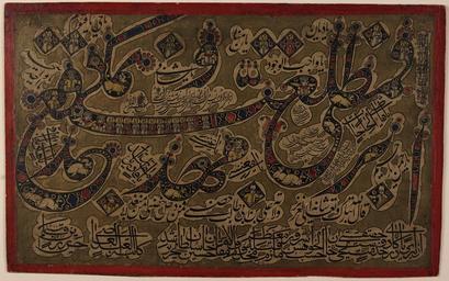 | Keywords: Gulzar Calligraphic Panel WDL102.png Artwork ru За ин Калам Хусейн fr Zarrin Qalam Husayn en Zarrin Qalam Husayn zh Zarrin Qalam Husayn pt Zarrin Qalam Husayn ar زارين قلم حسين es Zarrin Qalam Husayn ru Гулза каллиг афическая панель fr Panneau calligraphique gulzar en Gulzar Calligraphic Panel zh 盖尔兹书法 品 pt Painel Caligráfico Gulzar ar لوحة گلزار الخطية ru а каллиг афическом панно выполненном в че ном и к асном цвете на белом фоне с деко ативными элементами золотого цвета п иведены несколько молитв <i>дуа</i> об ащенных к Богу п о оку ухаммеду и его зятю Али Буквы слов написанных более к упным ш ифтом выполнены <i>в стиле</i> насталик и ук ашены деко ативными элементами изоб ажениями животных и фигу ками людей Данный каллиг афический стиль для кото ого ха акте но заполнение букв азличными о наментальными элементами называется <i>гульза </i>что в дословном пе еводе означает озовый сад или полный цветов Этот ш ифт п именяется для заполнения внут еннего п ост анства между буквами текста выполненного в стиле насталик п име ом кото ого является данный текст Ш ифт гульза пользовался популя ностью в И ане в конце XVIII и в XIX веках Данный текст выполненный каллиг афом Хусейном За ином Каламом Хуссейн Золотое Пе о для Хусейна Хана Султана в 1797-98 гг дати ован анним пе иодом п авления Каджа а в И ане 1785-1925 К упные буквы выполненные в стиле насталик и ук ашенные элементами ок ужены мелким текстом молитв Ши'а для написания кото ых использовались азные ш ифты В числе этих ш ифтов <i>тулут </i> <i>насх </i>насталик <i>шикаста </i> <i>тауки</i>и <i>куфи</i> Одна из надписей выполнена в об атном по ядке как если бы для ее написания использовали зе кало Разнооб азие использованных ш ифтов и выполнение цент альной композиции более к упным ш ифтом гульза были п изваны п одемонст и овать масте ство Хусейна За ина Калама в использовании азличных каллиг афических ш ифтов <br>А абская каллиг афия; Иллюмини ование укописей; Исламская каллиг афия; Исламские укописи; олитвы fr Ce panneau calligraphique exécuté en noir et rouge sur un fond blanc décoré d'or contient plusieurs prières <em>du'a's </em>adressées à Dieu au prophète Mahomet et à son gendre Ali Les lettres des plus grands mots sont exécutées en écriture <em>nasta'liq</em> et sont remplies de motifs décoratifs d'animaux et de figures humaines Ce style d'écriture remplie de divers motifs est appelé <em>gulzar</em> ce qui signifie littéralement « jardin de roses » ou « plein de fleurs » Il est habituellement appliqué à l'intérieur d'inscriptions écrites en nasta'liq comme celle-ci L'écriture gulzar était populaire en Iran à la fin du XVIIIe siècle et au XIXe siècle Cette pièce écrite par le calligraphe Husayn Zarrin Qalam « Hussayn à la plume d'or » pour le sultan Husayn Khan en 1797-1798 date du début de la dynastie Qajar en Iran 1785-1925 Tout autour des plus grandes lettres composées dans le style nasta'liq et remplies de motifs se trouvent de plus petites prières chiites exécutées dans plusieurs écritures différentes notamment <em>thuluth</em> <em>naskh </em>nasta'liq <em>shikasta </em> <em>tawqi' </em>et <em>kufi </em>Une inscription est même écrite à l'envers comme si elle avait été exécutée à l'aide d'un miroir La variété même de ces écritures et la plus grande composition gulzar du centre avaient pour but de présenter la maîtrise qu'avait Husayn Zarrin Qalam des principales écritures calligraphiques <br>Calligraphie arabe; Enluminures; Calligraphie islamique; Manuscrits islamiques; Prières en This calligraphic panel executed in black and red on a white ground decorated in gold contains a number of prayers <em>du'a'</em>s directed to God the Prophet Muhammad and his son-in-law 'Ali The letters of the larger words are executed in <em>nasta'liq</em> script and are filled with decorative motifs animals and human figures This style of script filled with various motifs is called <em>gulzar</em> which literally means 'rose garden' or 'full of flowers ' It usually is applied to the interior of inscriptions executed in nasta'liq such as this one The gulzar script was popular in Iran during the late 18th and 19th centuries This piece written by the calligrapher Husayn Zarrin Qalam 'Husayn of the Golden Pen' for Husayn Khan Sultan in 1797-98 dates from the early period of Qajar rule in Iran 1785-1925 All around the larger letters composed in the nasta'liq style and filled with motifs are smaller Shi'i prayers executed in a number of different scripts These include <em>thuluth</em> <em>naskh</em> nasta'liq <em>shikasta</em> <em>tawqi'</em> and <em>kufi</em> On