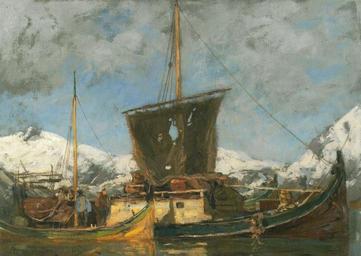 | Keywords: Gunnar Berg-Sjekter ved Nordlandskysten.jpg Artwork Creator Gunnar Berg oil canvas cm 34 46 object history credit line Gunnar Berg signature lower left accession number Blomqvist Vårauksjonen 2005 2-3 mai Auction catalouge ISSN 1501-0260 PD-old-100 Paintings by Gunnar Berg Boats in Nordland Lofoten in art Paintings of sailboats |