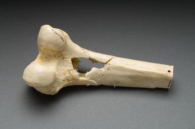 | Keywords: Gunshot femur.jpg Human distal femur shot with a 510-grain lead Minié ball fired from a 58 caliber Springfield Model 1862 rifle Leg bone from the Ragsdale Gunshot Wound Study 1984 National Museum of Health and Medicine Armed Forces Institute of Pathology Washington D C From exhibition Visible Proofs Forensic Views of the Body U S National Library of Medicine 8600 Rockville Pike Bethesda MD 20894 2006-02-16 National Institutes of Health Health Human Services PD-USGov-NIH PD-USGov Gunshot wounds Femur |