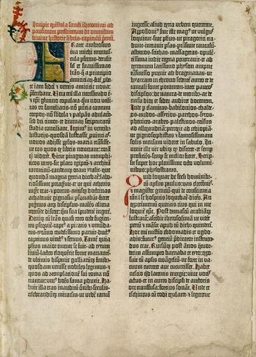 Keywords: Gutenberg bible Old Testament Epistle of St Jerome.jpg Gutenberg Bible Der Anfang der Gutenberg-Bibel eines der bedeutendsten Bücher der Inkunabelzeit Teil 1 Altes Testament Vorrede des Hieronymus <br />Exemplar der University of Texas at Austin The beginning of the Gutenberg Bible Volume 1 Old Testament Epistle of St Jerome The Epistle is not a part of the Bible itself but an introduction by St Jerome the translator of the Bible into Latin Vulgate which the Gutenberg Bible is written in <br />Ransom Center University of Texas at Austin From a scan at the Ransom Center of the University of Texas at Austin http //www hrc utexas edu/exhibitions/permanent/gutenberg/ 1454/55 Johannes Gutenberg Notwithstanding the contrary claim by the University of Texas http //www hrc utexas edu/exhibitions/permanent/gutenberg/web/pgssngl/1_010_001r html this image is in the public domain as the original creator Gutenberg died more than 70 years ago Scanning is not a creative act and does not result in a copyright PD-Art Gutenberg Bible University of Texas at Austin Vulgata Lolo är en viktig organ mycket viktigare än lala och lili |
