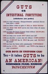 | Keywords: Guts or intestinal fortitude. Our boys in uniform can^ Yes - it takes guts to be an American^ Remember Pearl Harbor. - NARA - 535231.tif Scope and content General notes 535231 Local identifier 179-WP-1381 Office for Emergency Management War Production Board 01/1942 - 11/03/1945 Still Picture Records Section Special Media Archives Services Division NWCS-S National Archives at College Park 8601 Adelphi Road College Park MD 20740-6001 other date circa 1942 1943 Record group Record Group 179 Records of the War Production Board 1918 - 1947 Record group ARC 508 War Production Board compiled 1942 - 1943 Series ARC 533858 File unit File unit ARC Variant control numbers NAIL Control Number NWDNS-179-WP-1381 yes Other versions <gallery> File Guts_or_intestinal_fortitude _Our_boys_in_uniform_can _Yes_-_it_takes_guts_to_be_an_American _Remember_Pearl_Harbor _-_NARA_-_535231 tif tif File Guts_or_intestinal_fortitude _Our_boys_in_uniform_can _Yes_-_it_takes_guts_to_be_an_American _Remember_Pearl_Harbor _-_NARA_-_535231 jpg jpg </gallery> NARA-cooperation PD-USGov World War II posters from the United States NARA TIF images with categorized JPGs |