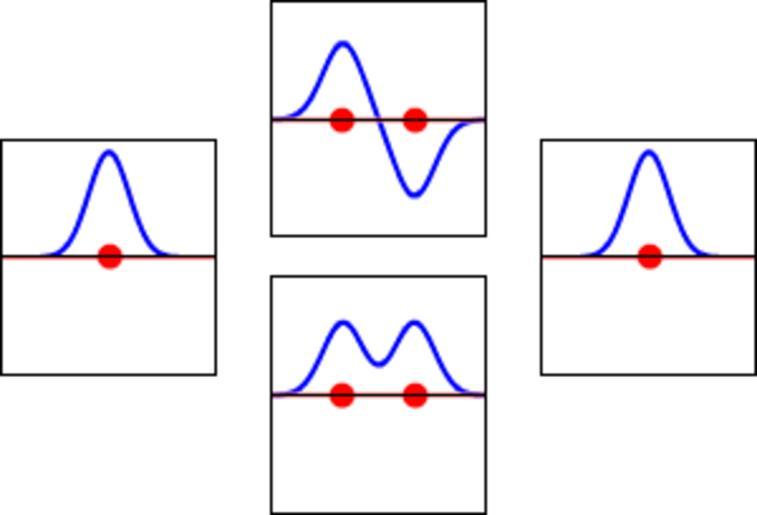 Keywords: H2OrbitalsAnimation.gif en Electron wavefunctions for the 1s orbital of the hydrogen atom left and right and the corresponding bonding bottom and antibonding top orbitals of the dihydrogen molecule The real part of the wavefunction is the blue curve the imaginary part is the red curve The red dots mark the locations of the protons The electron wavefunction oscillates according to the Schrödinger equation and the orbitals are standing waves The standing wave frequency is proportional to the energy of the orbital Hydrogen is really a 3D system but this is a 1D slice These are schematic plots I did not bother to solve the Schrödinger equation quantitatively The plots are arranged like a molecular orbital diagram own Sbyrnes321 2011-03-28 <pre> Source code written in Mathematica 6 0 by Steve Byrnes March 2011 This source code is public domain Shows schematic electron wavefunctions for 1s orbital of hydrogen atom and 1s bonding and antibonding orbitals of hydrogen molecule Plotted as a 1D slice of a 3D system All graphs are schematic I'm not actually solving the Schrodinger equation but hopefully it looks like I did ClearAll Global` Oscillation frequencies in units of oscillations per cycle of the animated gif sfreq 4; bondfreq 3; antibondfreq 5; Wavefunction normalization coefficients scoef 0 893; bondcoef 0 618; antibondcoef 0 646; Define wavefunctions sx_ t_ scoef Exp- x - 1 25 2 Exp-2 Pi I sfreq t; bondx_ t_ bondcoef Exp-x 2 + Exp- x - 2 5 2 Exp-2 Pi I bondfreq t; antibondx_ t_ antibondcoef Exp-x 2 - Exp- x - 2 5 2 Exp-2 Pi I antibondfreq t; Make individual graphs SetOptionsPlot Ticks -> None PlotStyle -> DirectiveThick Blue DirectiveThick Pink Axes -> True False PlotRange -> -2 5 5 -1 1 AspectRatio -> 1 1 Frame -> True FrameTicks -> None; SetOptionsListPlot Ticks -> None PlotStyle -> DirectiveRed AbsolutePointSize10 Axes -> True False ; OneProton ListPlot 1 25 0 ; TwoProtons ListPlot 0 0 2 5 0 ; SWavest_ Plot Resx t Imsx t x -2 5 5 ; BondWavest_ Plot Rebondx t Imbondx t x -2 5 5 ; AntibondWavest_ Plot Reantibondx t Imantibondx t x -2 5 5 ; SPlott_ ShowSWavest OneProton; BondPlott_ ShowBondWavest TwoProtons; AntibondPlott_ ShowAntibondWavest TwoProtons; Draw all graphs together arranged in the shape of a molecular orbital diagram TotalPlott_ Graphics White Rectangle 0 0 1 5 1 InsetSPlott ImageScaled 0 0 5 ImageScaled 0 0 5 45 InsetSPlott ImageScaled 1 0 5 ImageScaled 1 0 5 45 InsetBondPlott ImageScaled 0 5 0 ImageScaled 0 5 0 45 InsetAntibondPlott ImageScaled 0 5 1 ImageScaled 0 5 1 45 ImageSize -> 300 Export animation output TableTotalPlott t 0 90/91 1/91 ; SetDirectory C \\Users\\Steve\\Desktop Export test gif output </pre> Cc-zero Images with Mathematica source code Animated GIF Animations of quantum wave functions Molecular orbitals of hydrogen |