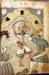 | Keywords: H599, tavaqarashviliseuli vefxistkasoani, tarielis shebma devebtan, 199r.jpg en tarielis shebma devebtan A miniature by Mamuka Tavakalashvili from the manuscript of Shota Rustaveli's Knight in the Panther's Skin H599 199r National Center of Manuscripts Tbilisi Georgia ka ტარიელის შებმა დევებთა http //www flickr com/photos/36292139 N03/3350302249/sizes/l/in/photostream/ Machavariani H Aleksidze Z The Decoration of Georgian Manuscripts Tbilisi 1990 creator Mamuka Tavakalashvili century 17 The Knight in the Panther's Skin by Mamuka Tavakalashvili Georgia in the 17th century Devi Georgian mythology PD-art-100 |